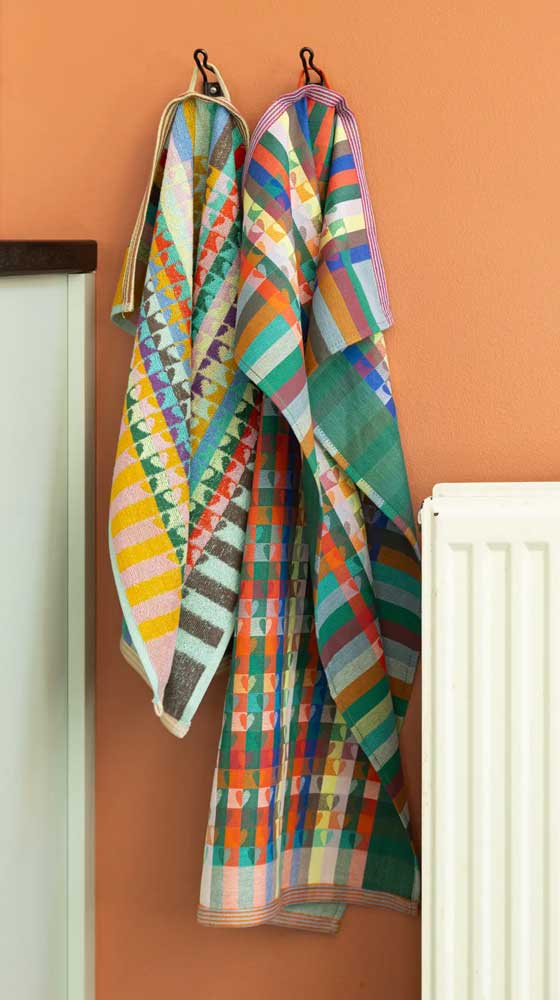 Zweierpack: Geschirrhandtuch und Küchenhandtuch (oder Gästehandtuch) mit grafischen Herzen von Foekje Fleur, mit außergewöhnlichen Farbkombinationen und frischem Design gefertigt aus Garn-Überproduktionen der Textilindustrie. Limitierte Edition. Wenn die Garne verbraucht sind, wird die Edition so nicht mehr nachproduziert.