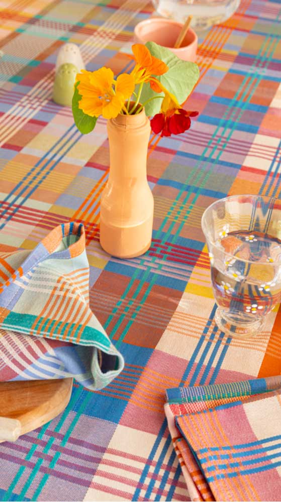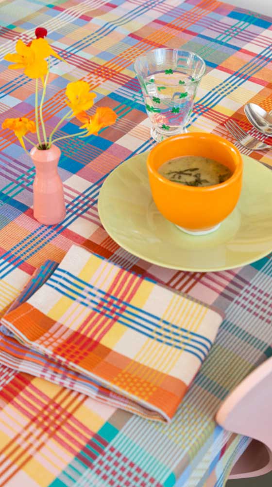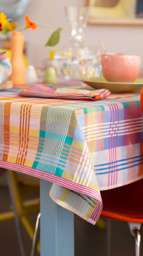 Schön gewebte Tischdecke von Foekje Fleur, mit außergewöhnlichen Farbkombinationen und frischem Design gefertigt aus Garn-Überproduktionen der Textilindustrie. Limitierte Edition. Wenn die Garne verbraucht sind, wird die Edition so nicht mehr nachproduziert.